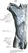 大伏在静脈【だいふくざいじょうみゃく】 Vein possessing valves that arises on the medial side of the foot and ascends medially, collecting most of the medial superficial cutaneous veins. It passes through the saphenous opening to empty into the femoral vein.(大伏在静脈は古くは薔薇静脈とよんだこともある。ギリシャ語のsaphisは「見える」という意味であるというが、他方アラビア語では「かくれた」という意味を表すという。このように語原的にはギリシャ語とアラビア語では反対の意味に解されているのは興味深いが、いずれにしてもVena saphenaの語原ははっきりしていない。大伏在静脈は下肢最大の皮静脈で、下肢の内側に沿って皮下組織の中を上行する。足背の内側縁にはじまり、内果の前を通るが、この部分で皮膚のうえからその走行をみることができる。伏在神経と伴行して下腿の内側を通り、膝関節の後内側を経て大腿内側面を上行し、鼡径靱帯の下方で深く入り、伏在裂孔で大腿静脈にそそぐ。この経過の途中、周辺より多くの皮静脈がこれに合流するが、とくに大腿の内側と後面よりの皮静脈は1本に合して伏在裂孔のやや下方で大伏在静脈にそそぐことがある。これを副伏在静脈という。また大腿の前面や外側面よりの皮静脈が合しこれにそそぐときは、とくに外側伏在静脈とよぶことがある。このときは大内々側面よりのものは内側伏在静脈という。)