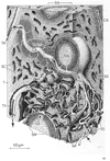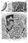 赤脾髄【せきひずい】 Portions of the vessels filled with blood.(新鮮な脾臓の断面は肉眼では広範囲に暗赤色の組織がみえるが、これが赤脾髄で、広い毛細血管後血管腔である脾洞とそれを取り囲む細網組織を含んでいる。)