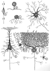 ニューロン;神経細胞;神経元【にゅーろん;しんけいさいぼう;しんけいげん】(神経細胞は核周部ともよばれる神経細胞体と、その突起からなる。細胞体の大きさ、形、突起の長さは多種多様で、その全形を把握するには渡銀法が適している。細胞体には一般の細胞と同じように小器官が存するが、その他の特徴のあるものとして、Nissl小体、神経原線維、色素顆粒がみられる。Nissl小体はチオニン、トルイジン青などの塩基性染料に染まり、細胞体の中で虎斑状にまだらに染め出されために虎斑物質ともよばれる。電顕で観察すると粗面小胞体の塊である。神経原線維は神経細管と神経細糸が集まり、銀に染まったものである。色素顆粒はリポフスチンを含み、リポフスチン顆粒、リポクロームなどとよばれる。水解小体の一種で年齢とともに増す傾向にある。また青斑や黒質の神経細胞体にはメラニンを含む。突起には、神経突起と樹状突起がある。前者は興奮を細胞体から遠心性に伝えるもので必ず1本、後者は興奮を突起から細胞体へ求心性に伝えるもので、神経細胞の種類によって、これを有しない物から、多数有するものまでみられる。神経突起のことを軸索とも呼ぶ。突起の数によって神経細胞は、単極神経細胞(突起が1本のもの)、双極神経細胞(突起が2本であるが、細胞体からでるところで合して1本になっているもの)、多極神経細胞(3本以上の突起をもつもの)に分けられる。突起のない神経細胞は完成した新形式には存在しない。これらの突起の中にももちろん神経細管や神経細糸は走っているが、Nissl小体は樹状突起の一部に認められるだけである。また、神経突起の起始部は小円錐状を呈し、軸索小丘(起始円錐ともよぶ)とよばれ、Nissl物質を欠く。神経細胞体から出るこれらの突起のことを神経線維ともよぶ。)
