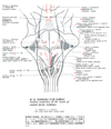 三叉神経運動核【さんさしんけいうんどうかく】 Motor nucleus for innervation of the muscles of facial expression. It is located laterally, beneath the facial nucleus.(三叉神経運動核は典型的な大型の神経細胞よりなり、全体は卵円形をなして運動根と主知覚核の内側に位置する。核からの線維は知覚根の進入点より内側で脳幹を出て三叉神経節の下を通り、下顎神経に加わる。運動核は中脳路核からの側副枝を受けて2ニューロン反射弓を形成するが、そのほかにも三叉神経二次線維が交叉性および非交叉性に連絡しており、皮膚、舌および口腔粘膜と咀嚼筋との間に反射弓を形成する。皮質延髄路線維の一部は直接両側性に運動核細胞に終止するが、他の線維は網様体細胞を介して間接的に終止する。)