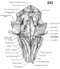青斑【せいはん】 Elongated collection of bluish-black cells lying below the lateral wall of the fourth ventricle.(青斑は中脳水道に近い菱形窩の最前部の外側にある細胞群で、三叉神経中脳路核の腹内側に位置する。肉眼的には第四脳室底において、上小脳脚の内側に吻尾側方向に伸びた青黒色の帯状のものとして認められる。これは細胞体に含まれるメラニン色素によるもので、そのため青斑には鉄色質の別名がある。青斑の細胞群は青斑核とよばれる。ノルアドレナリンを含む大型細胞の集団である。青斑核の腹側には同じような細胞が散在しており、青斑下核と呼ばれる。青斑核細胞の遠心性ノルアドレナリン線維は3群を形成する。①上行線維群:内側前脳束に入り扁桃核にいたるもの、帯状回線維となって帯状回、海馬台にいたるもの、その他梨状葉皮質、前頭葉新皮質に分布する線維からなる。②外側線維群:上小脳脚を通り小脳前葉の皮質の分子層、Purkinje細胞同区に分布する線維である。③下行線維群:これは広く脳幹に分布した後、脊髄前索、前側索を下行し、脊髄全長にわたって後角基部から前角にかけて分布する。求心性線維は次の領域からくる。視床下部(視索前野、後側、背側、外側視床下野)、中脳の中心灰白質、黒質、背側被蓋核、橋縫線核、その他脳幹に分布するカテコールアミンニューロンからの線維を受ける。機能は十分解明されていないが、REM睡眠と深い関係にある。)