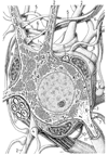交感神経幹【こうかんしんけいかん】 Chain of ganglia that are connected by nerve fibers and lie on the left and right sides of the vertebral column, extending from the base of the cranium to the coccyx.(脊椎全長の両脇に1本ずつの交感神経幹(神経節のためのふくらみをそなえる)が存在している。同幹の頚部領域には3個、胸部領域には11~12小、腰部領域には5個、仙骨部領域(骨盤内)には4~5個の幹神経節がある。左右の交感神経幹は脊柱に近接しており、脊柱下端の所では1個の不対神経節につながる。(求心性神経線維) 内臓からの感覚を伝える有髄性の求心性神経線維は交感神経節を素通りして、白交通枝を介して脊髄神経内に入り、その脊髄神経節が所属する髄節の高さの後根神経節の中に含まれる神経細胞体に達する。同じ細胞体からの、中枢に向かう軸索がそののち脊髄に入り、脊髄内での内臓反射路の形成にあずかったり、あるいは脳の自律神経中枢にまで上行したりする。)
