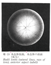 水晶体【すいしょうたい】 Lens suspended by the ciliary zonule between the pupil and vitreous body. It measures 9-10 mm in diameter and is about 4 mm thick.(水晶体は虹彩の後方、硝子体の前方に位置し、双凸面レンズ構造をもつ。赤道直径約9mm、水晶体軸(前、後極を結ぶ直線)3.7~4.4mm、前面弯曲度から8mm、後面弯曲度~6mm、屈折率1.36(中央部)~1.42(辺縁部)。水晶体は無色透明な水晶体包(前面で厚く、後面で薄い粘液多糖体層で、水晶体上皮の基底膜が発達したもの)におおわれる水晶体質よりなる。水晶体質はより軟らかい上皮と硬い核に分かれやすく、胎児では雌で水晶体包に切れ目をいれるとはじけるように裂ける。生体では前、後極から発する数本の水晶体放線がわずかに認められ、胎児では前後両面放線がわずかに認められ、胎児では前後両面に、たがいに120°に交わる3本の放線(前面逆Y字、後面正Y字形)を示す。水晶体の構成要素は水晶体線維で、発生初期の単層の水晶体胞の後壁の細胞のみが著しく長大化したものである。前面に層単層の水晶体上皮は水晶体胞前壁の原型を保つ。赤道より後面にいくにしたがい長細い六角形の水晶体線維の束へと移行する。胎児期の放線は水晶体線維束の付着点をなす中隔に一致し、前極からおこる線維は後面の赤道近くの最寄りの放線に、前面赤道近くの中隔よりおこる線維は後極へ向かう。水晶体線維は緊密かつ生前と配列するが、微絨毛を出して細い細胞管腔を確保し、水および代謝物質の移送路を形成する。生体の水晶体には血管の神経の分布が認められない。胎児の水晶体包は硝子体動脈により養われるが、妊娠末期に道動脈が閉鎖する。老年者では前後面の弯曲度が減って扁平となり、黄白色を帯びる傾向にある。この変化が進行したものを白内障cataractという。全体の25%を占める水晶体蛋白はα-およびβ-クリスタリンと不溶性アルブモイドよりなり、そのほかにグルタチン、ビタミンCなどが含まれる。)
