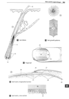 毛【け】 Collective term of any type of hair.(毛は、表皮が真皮内に陥入した形で生じた毛包から伸び出している。毛包は皮膚表面に対して常に斜めの方向をとっており、毛包下端の膨隆部(毛球hair bulb)は真皮の奥深くに位置している。毛球下面には陥凹部があり、そこに血管に富む結合組織が入り込み、毛乳頭hair papillaをなす。深部毛包壁を真皮浅層に結びつける平滑筋が立毛筋である。)