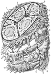 汗腺【かんせん】 Usually small eccrine glands, although in specific regions (anus, genitals, axilla) they are present as large apocrine glands.(汗腺はらせん状の形の長い管状腺であり、口唇、爪床、陰茎亀頭および陰核を除くすべての皮膚に分布している。汗腺は真皮全体を貫いており、その下端が浅筋膜内に存在することもありうるので、表皮の変形物である皮膚付属器のうちで最も深層にまで入り込んだ構造であるといえる。汗腺の開口を汗孔sweat poreという。)