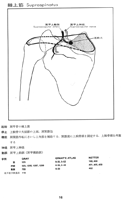 棘上筋【きょくじょうきん】 o: Supraspinous fossa, supraspinous fascia, i: Greater tubercle of humerus, capsule of glenohumeral joint. Abduction, tenses the joint capsule, minimal rotational components. I: Suprascapular nerve.(棘上筋は肩甲骨の棘上窩(外側は肩甲骨頚まで)および、それをおおい肩甲骨縁と肩甲棘に付着している筋膜から起こっている。腱は肩峰の下を通り、肩関節包に線維を放散させ、上腕骨の大結節の上面に付いている。機能としては上腕外転にさいし三角筋を補助する。関節窩に上腕骨頭を固定する。上腕骨頭を外旋する。神経支配は肩甲上神経。動脈は肩甲上動脈(肩甲横動脈)から受ける。)