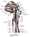 棘下筋【きょくかきん】 o: Infraspinous fossa of scapula, spine of scapula, infraspinous fascia, i: Greater tubercle of humerus. Lateral rotation, strengthens joint capsule. 1: Suprascapular nerve.(棘下筋は棘下窩(肩甲骨頚を縁どる部分は除く)から起こり、肩関節包と上腕骨の大結節中央面につく。これは小円筋とともに肩甲骨縁に付着している筋膜によっておおわれている。機能としては小円筋とともに上腕骨頭を外旋する。神経支配は肩甲上神経。動脈は肩甲上動脈(肩甲横動脈)、肩甲回旋動脈より受ける。)