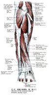 回外筋【かいがいきん】 o: Lateral epicondyle of humerus, radial collateral ligaments, anular ligament of radius, and supinator crest of ulna, i: Anterior surface of radius. Supination. I: Radial nerve.(回外筋は上腕骨の外側上顆、肘関節の外側腱索と尺骨の回外筋稜から起こる。薄い筋板は橈骨の外側を回り、後面から、橈骨粗面と円回内筋の停止部との間の橈骨の前面に付く。橈骨神経深枝はこの筋の近位辺縁近くで筋に入り、ラセン状の“回外筋管”を通って筋の遠位に抜ける。)
