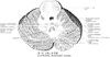 室頂核;小脳内側核;内側核【しつちょうかく;しょうのうないそくかく;ないそくかく】 Medially situated nucleus.(室頂核は小脳核のうち最も内側で、第四脳室上壁の正中線知覚に位置する。核の中で細胞に差があり、小型細胞が腹側を示す。この核の外側縁の細胞は腹外側に伸びて前庭神経核に向かっているが、GolgiⅡ型細胞は存在しないようである。他の小脳核の細胞と異なり、室頂核細胞からは交叉性および非交叉性軸索が出、そのうち交叉性のものは核の吻側部から多く出る。小脳核の細胞はPurkinje細胞とは異なり、促進的で、小脳の外に投射する。免疫組織化学の研究結果から、小脳核の全ての細胞の促進性伝達物質はグルタミン酸塩およびアスパラギン酸塩であるらしいと考えられる。小脳皮質からの唯一の出力であるプルキンエ細胞は一定の配列様式をもって小脳核に投射し、小脳髄質中に存在する細胞群(小脳核)から起こる促進性出力系に対して抑制的に働く。室頂核からの遠心性線維は、①上小脳脚を通らない、②大部分が小脳内で交叉する。③脳幹各部の神経核に投射する、点で特徴的である。室頂核からの交叉性線維は鈎状束を通って小脳の外に出るが、これは上小脳脚の周囲を弓形に走る。また非交叉性線維は傍索状体を通って脳幹に投射する。鈎状束中の交叉性線維は室頂核のすべての部位の細胞から起こり、その数は傍索状体中を走る非交叉性線維より多い。室頂核からの投射線維のうちで最も多いのは下位脳幹へ到るものである。前庭神経核への投射は両側性で、前庭神経外側核および下核の腹側部に対称性に終わる。室頂核網様体線維は主に核の吻側部から起こり、大部分交叉して、①巨大細胞性網様核の内側部、②橋網様体尾側部、③傍正中網様核背側部および④外側網様核の各部に終止する。交叉性の室頂核橋線維は鈎状束から分かれて腹側に走り、橋核の背外側部に終わる。また少数の交叉性室頂核脊髄線維が上部頚髄まで下行し、そこで前柱細胞に接続する。室頂核からの線維のうち、少数のものは脳幹の背外側部を上行し、側枝を上丘および交連核に送り視床の細胞が疎らな部位(VLcとVPLo)に両側性に終わる。これらの終止は歯状核および中位核からの中位核からの終止と重なり合うことはない。)