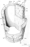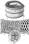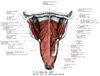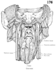 気管【きかん】 Elastic tube between the larynx and bronchi.(喉頭の下に連なる気道の管状部で、第6頚椎の高さにはじまり、気道の前を垂直に下り、第4頚椎の前で左右の気管支に分岐する。この分岐部を気管分岐部という。気管支鏡で分岐部を上から見ると、その正中部に左右の気管支を隔てる高まりがある。この高まりを気管竜骨という。気管壁には、硝子軟骨性の気管軟骨の輪が一定の間隔をおいて重なり、軟骨間は輪状靱帯で結合する。気管軟骨は幅3~4mmで15~20個を数える。気管軟骨は完全な輪ではなく、全周の4/5~2/3を占める馬蹄状を呈する。軟骨性の支柱を欠く部は正中部後壁をなし、膜性壁とよばれる。膜性壁には平滑筋(気管筋)を含む。気管内面は多列絨毛円柱上皮で、絨毛の運動の方向は上向きである。粘膜固有層には弾性線維が多く、粘膜下組織には胞状の混合腺(気管腺)を数多く含む。日本人の気管の長さは10cm前後である。)
