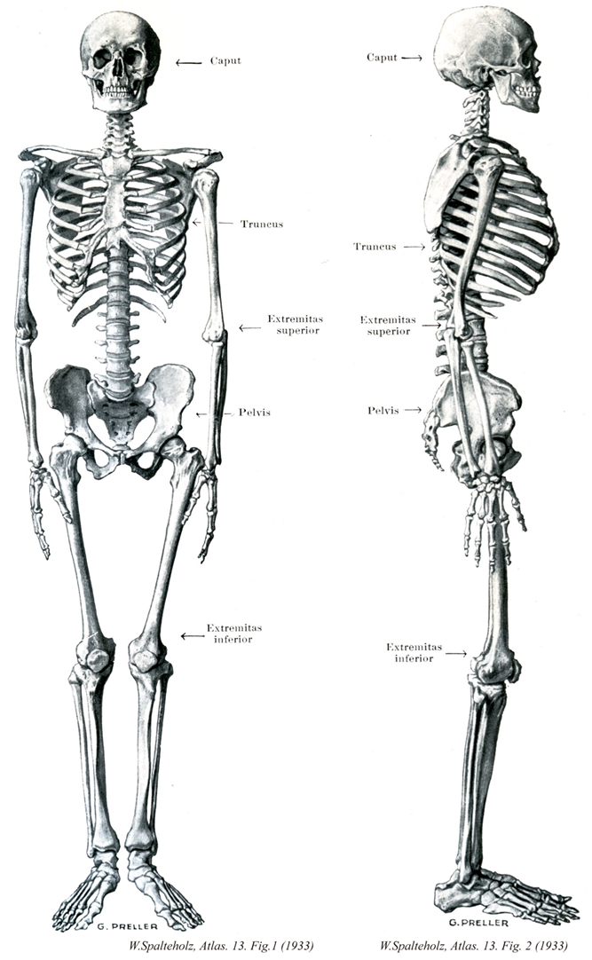 →(人体は外形からも内部構造からも体幹と体肢に分けられる。体幹は身体の中軸をなす部分で、体肢はこれから左右に出た棒のような2対の突起(上肢と下肢)である。体幹と体肢はその組み立てて機能がまったく違っている。体幹は内部に内臓と中枢神経とを収め、生命の維持に必要な諸器官はすべてここに集まっていると考えてよい。したがってそれを動かす筋肉、それに脈管と神経が分布しているに過ぎない。だから、体幹はこれを切断すれば直ちに生死に関わるが、体肢の損傷や切断は生命の維持には別状ない。四肢を全部失っても生存することが出来る。体幹はさらにぐちの4部に分けられる。①頭、②頚、③胸、④腹)