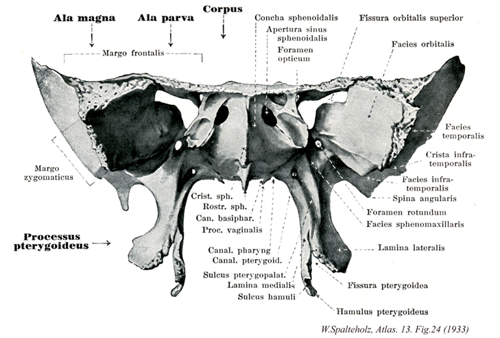 →(蝶形骨は頭蓋底のほぼ中央部にあり、上面観は羽を広げた蝶のように、また前方から見るとコウモリのように見える最も不規則な形をした無対性骨である。蝶形骨は発生学的には四つの部分、すなわち体、大翼、小翼および翼状突起に4部に分けられる。これはらは生後1年以内に癒合して単一の骨となる。蝶形骨は9種の周囲の骨と相接しており、それらは後頭骨、側頭骨、頭頂骨、前頭骨、篩骨、鋤骨、上顎骨、口蓋骨、頬骨である。Sphenoidaleはクサビ(sphen)に似た(eidos)という意味で、蝶とは無関係。これは多くの骨の間にクサビのようにはまりこんだ骨だからである。日本名も以前は楔状骨であり、更に古くは胡蝶骨と呼ばれたこともある。楔状骨の名は現在では足根骨の一つに占有されている。)