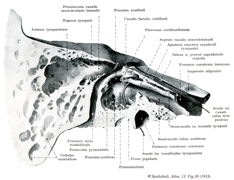 - 030_10【Processus cochleariformisサジ状突起;匙状突起 Processus cochleariformis】 Spoon-shaped bony process above the promontory at the end of the canal for the tensor tympani. Together with a connective-tissue sling it serves as a pulley for the tensor tympani.
