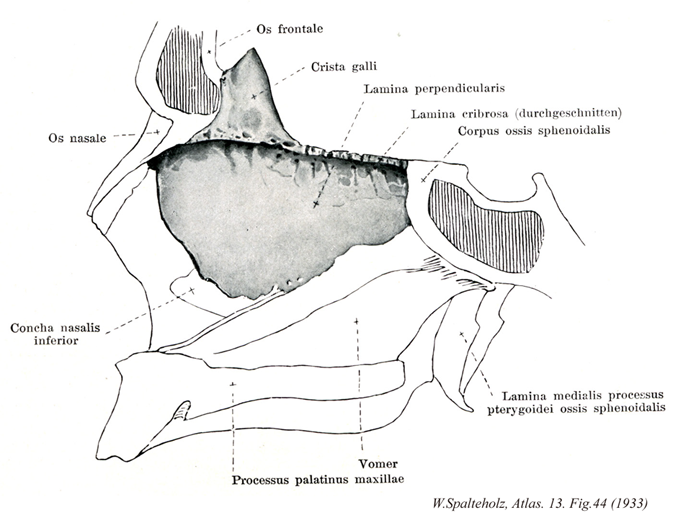 →(垂直板は篩板の下面正中線から下方に向かい、正中面にほぼ一致して垂直に立つ不正三角形の薄い骨板で、鼻中隔骨部の前上部をつくる。前縁の上部は前頭骨の鼻棘、同じく下部は鼻中隔のの軟骨に、後下縁は鋤骨に、後上縁は蝶形骨体に接する。垂直板上部の左右両面には嗅神経の通路となる多くの細い溝または管がある。)