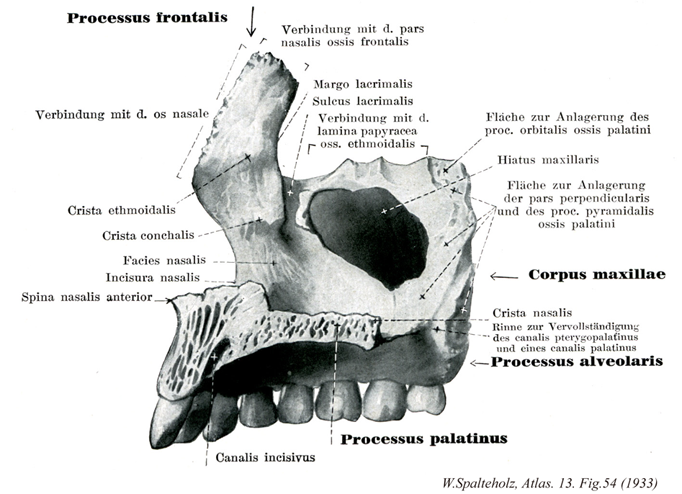 →(上顎骨鼻腔面の中央に大きな開口。倒立三角形上の上顎洞裂孔がある。これは上顎洞の入口であるが、完全な頭蓋ではその大部分が他の骨(口蓋骨、篩骨、下鼻甲介)によって内側(鼻腔側)からふさがれる。この裂孔の上皮は篩骨蜂巣の一部の外側壁をつくるために生ずる多くのくぼみを見る。)