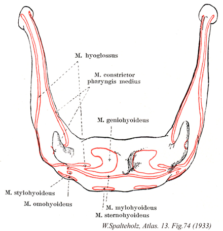 →(下顎骨と喉頭との間で舌根部にある独立したU字形の小骨である。体、大角、小角を有する。体は舟の形を呈し、膨隆部が前方を、陥凹部が後方を向いている。前面には十字形の隆線があり、これにより4区画に分けられている。上区には外側に舌骨舌筋、内側にオトガイ舌筋がつき、下区には外側に肩甲舌骨筋、内側に胸骨舌骨筋がつく。大角は体の外側端から後上方に延びる骨片で、その先端はは肥厚する。小角は体と大角の結合部から円錐形を呈して後上方に着きだし、その先端は茎突舌骨靱帯によって側頭骨茎状突起と連結する。この靱帯はまれに骨化することがある。舌骨は系統発生的に鰓の骨格の一部に相当するもので、舌骨体の上部、小角、茎突舌骨靱帯および側頭骨茎状突起が第2臓弓軟骨、舌骨体の下部と大角が第3臓弓軟骨に由来する。Hyoideumはギリシャ語のυ(hy)に似た(eidos)という意味の形容詞。なお日本語の「舌骨」はドイツ名Zungenbeinの直訳であるが、この骨は舌の根もと(舌根)に存在して、筋肉を介して舌と密接な関係がある。)