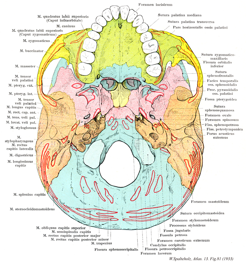 →(外頭蓋底は下顎骨・舌骨を除く頭蓋の下面をいう。その範囲は上顎骨の歯槽弓にはじまり、側頭下稜、頬骨弓の後端、乳様突起の内側、上項線、外後頭隆起に至る境界とする。外頭蓋底は全体とふくれ上がって凹凸に富み不整複雑な面である。)