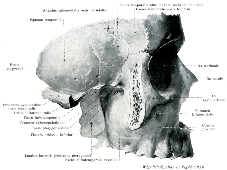 →(側頭下窩は側頭窩の内下方につづく部分である。前壁は上顎骨側頭下面、内側壁は蝶形骨翼状突起外側板、上壁は蝶形骨大翼側頭下面および側頭骨鱗部の一部である。この窩をみたしているものは、下顎骨筋突起、側頭筋下部、内側・外側翼突筋、下顎神経、下顎動脈およびそれらの分枝、翼突筋静脈叢などである。側頭下窩は前方は下眼窩裂により眼窩と、内方は翼上顎裂により翼口蓋窩と、上方は卵円孔および棘孔により内藤が胃底の蝶形骨大翼大脳面に通じている。)