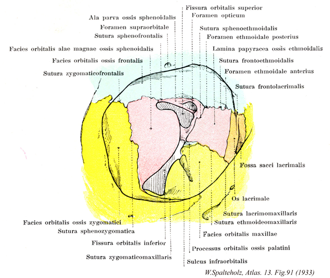 →(眼窩は眼球とその付属器とを容れる不規則な四角錐体状の大きなくぼみで、最深部はその後内方にある。錐体底にあたる部はほぼ四辺形の眼窩口で、軽度外下方に傾いており、顔面に開いている。その上縁を眼窩上縁、下縁を眼窩下縁という。眼窩上縁は前頭鱗からなり、その内側半分に2個の切痕または孔があり、その内側のものを前頭切痕(まれに前頭孔)、外側のものを眼窩上孔(まれに眼窩上切痕)とう。眼窩下縁は上顎骨体および頬骨からなり、その下方に眼窩下孔が開口している。眼窩は上・下・内側・外側の4壁を有し、7種類の骨による10部より形成されている。上壁は大部分が前頭骨眼窩面および蝶形骨小翼腹側面よりなり、外側には涙腺窩、小翼内には視神経管があり、ここに視神経および眼動脈を通す。下壁は大部分が上顎骨眼窩面によりなるが、外側の一部が頬骨眼窩面、後方の小部分が口蓋骨眼窩突起により形成されている。また後方から前方へ眼窩下溝その延長部である眼窩下管が走り、これが既述の眼窩下孔に開口する。内側壁は大部分が篩骨眼窩板により形成され、残りの部分のうちの前部は上顎骨前突起および涙骨、後部は蝶形骨体側面最前部によって形成されている。なお篩骨眼窩板上縁と前頭骨眼窩部との間には、前篩骨孔および後篩骨孔があり、前者は鼻腔に行く前篩骨神経および前篩骨動脈を通し、後者は篩骨蜂巣に行く後篩骨神経および後篩骨動脈を通す。また内側壁の前部にある涙嚢窩は、上顎骨の前涙嚢稜と涙骨の孔涙嚢稜との間にあり、稜骨の涙嚢溝が合して形成されたものである。外側壁は前半部は頬骨眼窩面、後半部は蝶形骨大翼眼窩面と上壁の蝶形骨小翼との間には頭蓋腔に通ずる上眼窩裂があり、動眼神経、滑車神経、眼神経、外転神経、上眼静脈などを通す。また外側壁後半部の蝶形骨大翼眼窩面と下壁の上顎骨眼窩面との間には翼口蓋窩および側頭下窩に通ずる下眼窩裂があり、眼窩下神経、頬骨神経、下眼静脈などを通す。)