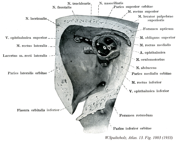 →(眼窩の外側壁は頬骨の眼窩面および蝶形骨大翼眼窩面からなり、その下部にある小さな頬骨眼窩孔は頬骨管(頬骨神経の通路)の入口である。外側壁の後半は上壁との間に上眼窩裂(動眼神経、滑車神経、眼神経、外転神経、上眼静脈などの通路)、下壁との間に下眼窩裂(眼窩神経、頬骨神経、下眼静脈などの通路)をはさみ、上眼窩裂は中頭蓋窩、下眼窩裂は側頭下窩に通ずる。霊長類以外の哺乳動物では、外側壁はなく、眼窩は直接に側頭窩に連なる。)