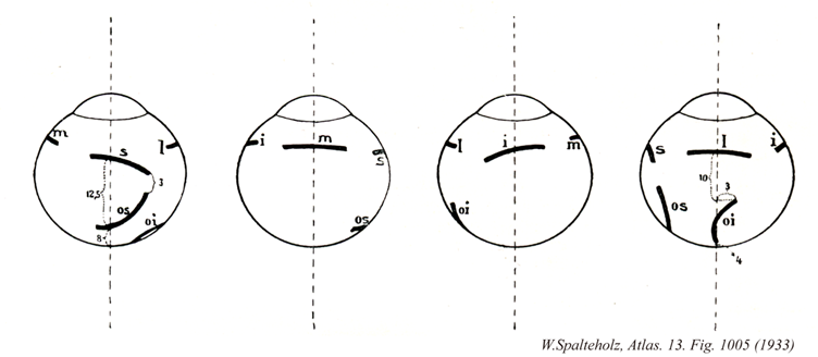 - 1005_04【Lateral rectus muscle外側直筋;外側眼球直筋 Musculus rectus lateralis; Musculus rectus bulbi lateralis】 o: Common tendinous ring and lesser wing of sphenoid, i: 5.5 mm behind the corneal margin. Action: Abduction of the corneal pole. I: Abducent nerve.