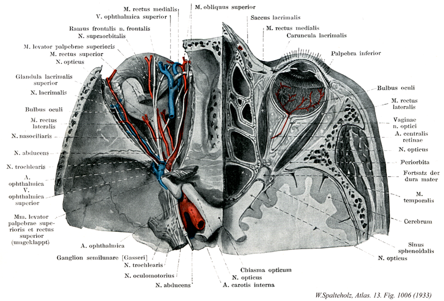 →(眼球、類の、鼻粘膜の一部および鼻背皮膚に分布する鈍知覚神経で、上眼窩裂を通って眼窩に入り視神経と上直筋との間を通って斜めに前内側にすすみ、前篩骨孔のあたりで滑車下神経と前篩骨神経とに分かれる。その経過中に出す枝はつぎのようである。)