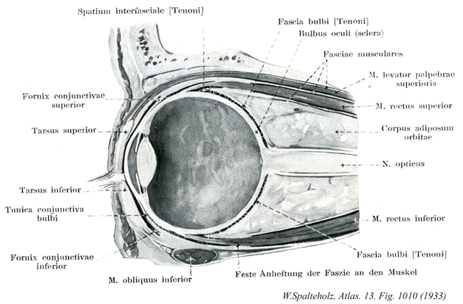 - 1010_08Tenon's capsule【Fascial sheath of eyeball眼球鞘;テノン嚢 Vagina bulbi; Capsula bulbi】 Connective-tissue sheath between the eyeball and orbital fat. It is attached posteriorly at the optic nerve to the sclera. It ends anteriorly below the conjunctiva. It is separated from the sclera mostly by the episcleral space.