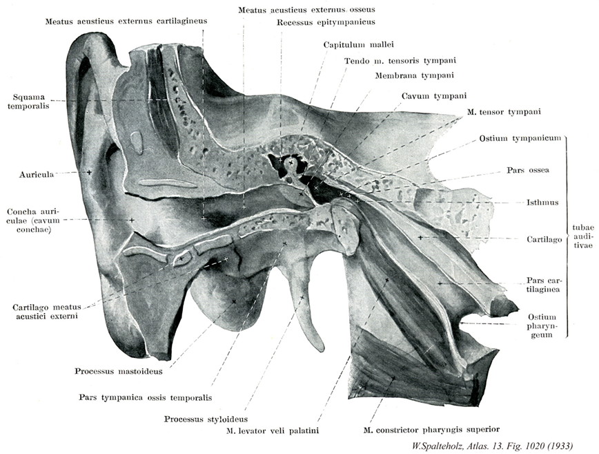 →(『ユースタキ管、欧氏管、オイスタヒ管』:日本ではオイスタキオ管とかユースタキ管ともいわれる。イタリアの解剖学者Bartolommeo Eustachio [Eustachius] (1524-1574)の名を冠するが、アリストテレスらも記載している。彼の名はオイスタヒ弁Eustachian valve(=下大静脈弁)にも残っている。耳管は鼓室と咽頭腔とを結ぶ長さ約33mmの管であって、前者へは耳管鼓室口をもって、後者へは耳管咽頭口をもって、それぞれ開く。耳管の内腔は平時は閉じているが、食物を飲み込むときには口蓋帆張筋などの働きにより開くようになっている。食物に限らず唾液をのみをごくりと飲み込む際にも同じこと起こる。耳管の粘膜は咽頭鼻部の粘膜のつづきとなっており、線毛上皮を有する。粘膜固有層内には耳管線(粘液を分泌する)の腺体やリンパ小節が含まれている。耳管粘膜に接する耳管壁部分は咽頭に近い部分では耳管軟骨により保護されている(耳管軟骨部)が、鼓室に近い部分(骨部)では骨膜となっている。)