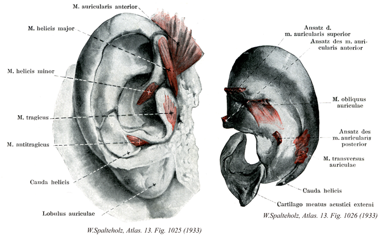 →(耳介の筋はヒトでは遺残であり、機能的意義を有しない。耳介根部の前方、上方および後方に付着する3筋が区別される。前耳介筋は側頭筋膜で起始する。参考:上、前、後耳介筋は退化的でで、ほとんど働きがない。しかし、練習によってかなり動かせることがある。なかでは、上耳介筋が最も幅が広い。前耳介筋は23%に欠如する(池田一二:福岡医大誌))
