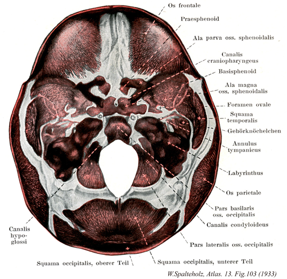 →(後頭骨の底部は大後頭孔前縁の前方にある長方形の板状部で、内頭蓋底と外頭蓋底の斜台の下半分を作る。両側縁は側頭骨の錐体と軟骨結合している。)