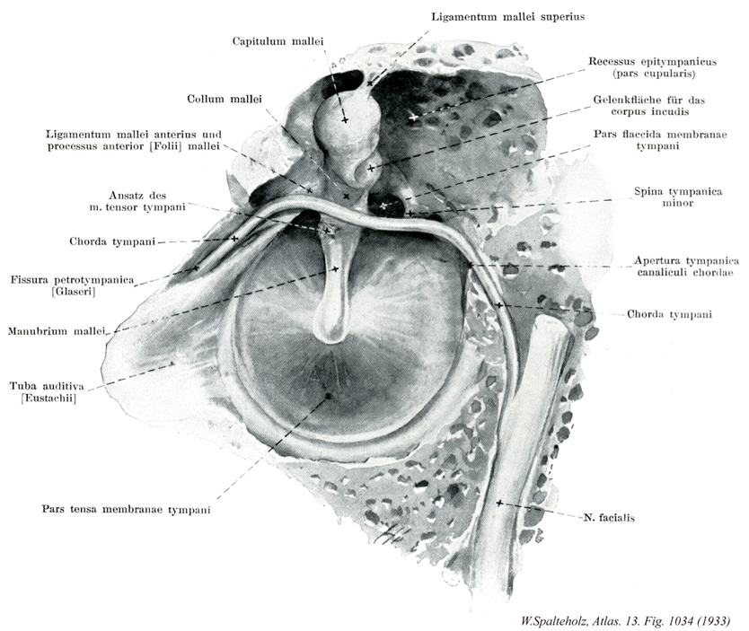 →(耳管上方の鼓膜張筋半管中にある。腱はサジ状突起でほぼ直角に外側へまがり、ツチ骨柄の底部へつく。神:鼓膜張筋神経。 (Feneis))