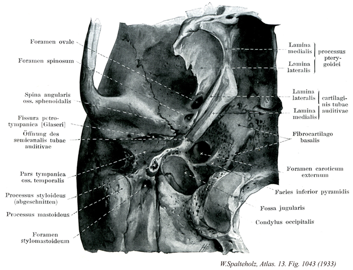 - 1043_04Glaserian fissure グラーザー裂【Petrotympanic fissure錐体鼓室裂 Fissura petrotympanica】 (glaserian fissure). Fissure located posteromedial to the mandibular fossa between the tympanic part and the visible strip of the petrous part of the temporal bone. Its medial part can lodge the chorda tympani.