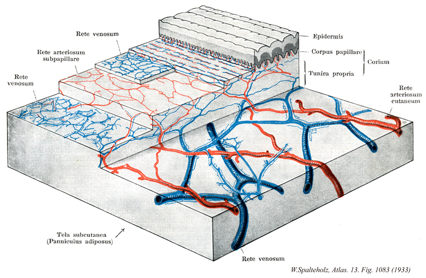 →(皮下組織は皮膚と深部の構造物の間の空間を埋める疎性結合組織で、一般に脂肪細胞に富む。脂肪細胞は膠原線維によって大小の集団にまとめられ、真皮と深部の構造物の間を埋めており、皮下脂肪組織とよばれる。皮下脂肪組織は栄養分および水分の貯蔵所であるだけでなく、機械的な外力に対する緩衝装置であり、外界の温度変化が体内に波及することを防ぐ断熱装置でもあり、さらに体に丸みを与え体系を調えるなどの意義をもつ。皮下脂肪組織はいたるところおで皮膚支帯に貫かれている。皮下脂肪はまた大小の血管および神経によって貫かれている。皮膚に分布する動脈は皮下組織と網状層の移行部に置いて、皮膚の表面に平行に広がる動脈網を作り、これから真皮と皮下組織の両方向に枝を出す。真皮に入った動脈は乳頭層の基底部で再び動脈網をつくり、ここから乳頭に毛細血管を送る。乳頭内の毛細血管のループにはじまる静脈はまず乳頭の基底部の静脈に注ぎ、網状層内でさらに静脈網を形成した後、網状層と皮下組織の移行部に広がる静脈叢に注ぐ。網状債には動静脈吻合であるホイヤー・ボロッサー器官organ of Hyer-Grosserがみられる。皮下組織の表層部には圧覚の感覚装置と考えられ照り右ファーター・パチニ小体が散在する。)