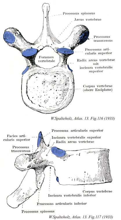 →(椎弓根は椎体に付く椎弓の前部。上縁と下縁にある上椎切痕と下椎切痕により、上下から狭められる。多くの椎骨では椎弓板は椎弓根より深く、したがって椎弓根は椎体後面の上端寄りに着くようにみえる。)