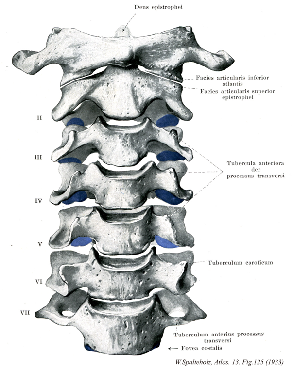 - 125_11【Anterior tubercle (of cervical vertebra)前結節(頚椎の) Tuberculum anterius (Vertebrae cervicalis)】 Anterior protuberance found on the second to seventh cervical vertebrae for muscle attachment.