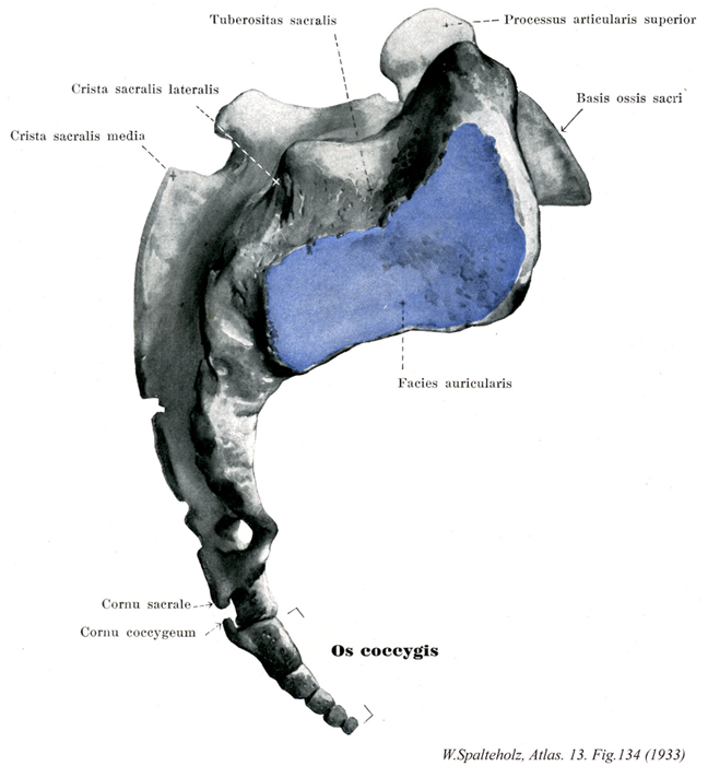 - 134_09【Auricular surface (of sacrum)耳状面(仙骨の) Facies auricularis (Os sacrum)】 Ear-shaped surface at the level of the upper 2-3 sacral vertebrae for articulation with the ilium.