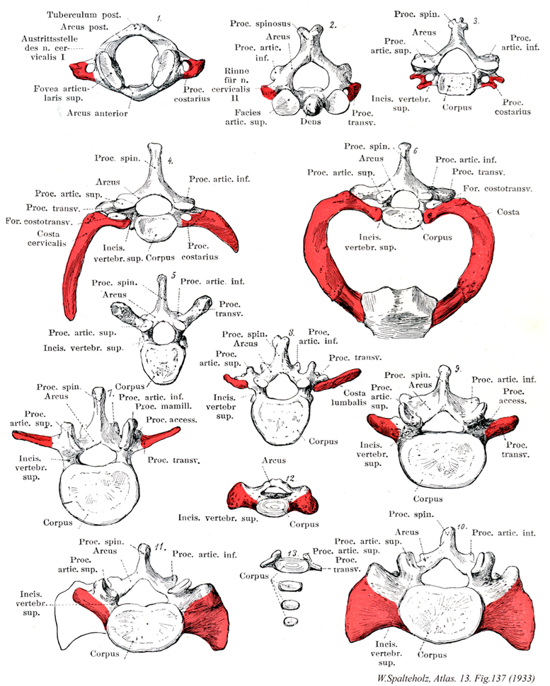 →(第7頚椎の横突起の形成が不完全で、肋骨原基が不完全に癒合していると、この原基から生じる部分は明らかに椎骨とは区別することができる。肋骨原基が独立して(癒合しないで)残っていると、頚肋が生じる。頚肋は通常両側性に現れる。一側にだけにみられる場合には右側よりも左側に多い。横突起は頚椎によっては2分していることがある。第7頚椎では前結節が欠けていることが多い。)