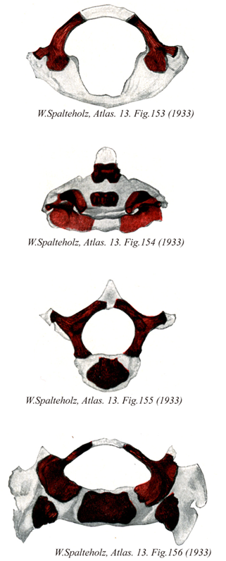 →(椎骨はヒトの場合は7個の頚椎、12個の胸椎、5個の腰椎、5個の仙椎(1つの仙骨に融合)と4個の尾椎(1つの尾骨に癒合)の33個からなる。一般的特徴として、おのおのの椎骨の椎体は前方に位置し、その大きさは配置によって異なる。頚椎は最も小さく、腰椎に向かってしだいに大きくなる。頚椎は大きな椎孔を取りかこんでおり、椎体から後方に向かう2本の椎弓根と椎弓板からなる。椎弓根と椎弓板が合するところからは横突起が外側にでる。椎弓板は正中で合し、後方に向かって棘突起を形成する。椎弓は4つの関節面を持ち、2つは上位の椎孔とほかの2つは塊の椎骨との関節を形成する。椎孔は脊柱管を形成しそのなかに脊髄をいれる。)