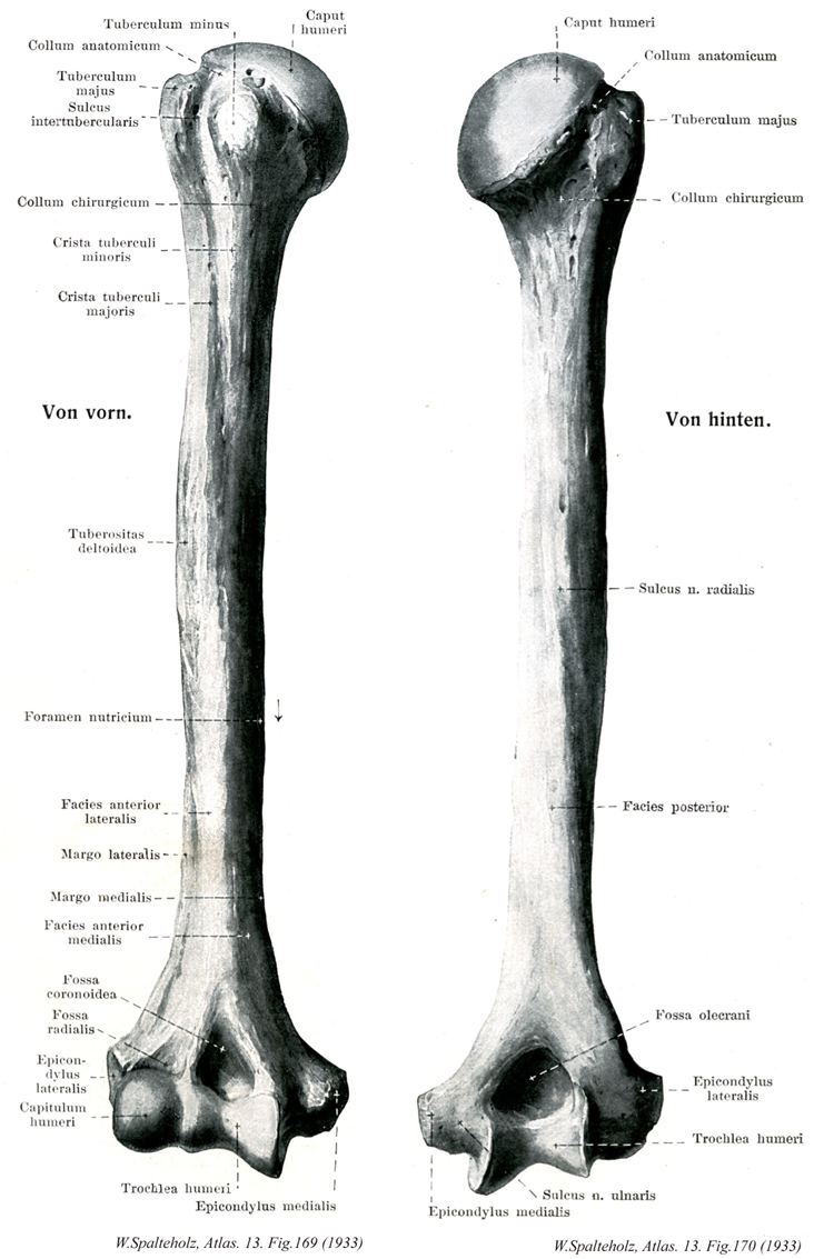→(上腕骨は典型的な長管状骨であるが、上端は半球状にふくらんで上内側を向き、下端は前後に扁平である。上端の半球状の部分は大きな関節面で上腕骨頭といい、その基部の周囲にある浅いくびれを解剖頚という。上腕骨頭の前外側には2個の隆起があり、口蓋側のものを大結節、前内側のものを小結節という。両結節の下部はともに下方へ細長く延び出して、それぞれ大結節稜および小結節稜を作っている。大小の結節および結節稜の間には上下に走る溝があり、結節間溝という。大小稜結節のすぐ下で、上腕骨体に移行する部位は骨折を起こしやすく外科頚とよばれる。上腕骨体は上腕骨の大部分を占める骨幹の部分で、上半は円柱状、下半は三角柱状であり、下端は前後に扁平である。上腕骨体の外側面には、第毛節稜のすぐ下からはじまり、上腕骨体の中央に達する三角筋粗面がある。この粗面の後下方には橈骨神経溝という浅い溝があり、上腕骨体の後面を状内側から下外側に向かってラセン状に走っている。上腕骨の下端部は著しく扁平に広がり、内側方に内側上顆、外側方に外側上顆が突き出しており、内側上顆の後面には尺骨神経溝がある。この二つの上顆の間には前腕の骨と連結する上腕骨窩があり、内側の上腕骨滑車と外側の上腕骨小頭に区別される。前者は中央が浅くくぼんだ円柱状で尺骨の滑車切痕と関節をつくり、後者は小半球状で橈骨頭窩に面している。上腕骨下端部前面には二つのくぼみがあり、滑車の上方にあるものを鈎突窩、小頭の上方にあるものを橈骨窩という。これは肘を強くまげたときに尺骨の鈎状突起および橈骨頭がはまりこむところである。また、後面には滑車のすぐ上方に楕円形の深いくぼみがあり肘頭窩という。これは肘をまっすぐに伸ばしたときに尺骨の肘頭がはまりこむ場所である。鈎突窩と肘頭窩はうすい骨質をはさんで前後面から互いに相接しているが、このうすい骨質に孔があいていることがあり、これを滑車上孔という。内側上顆の上方にはまれに小さい突起がみられることがあり、これを顆上突起という。顆上突起と内側上顆の間には靱帯が張り、その間を正中神経が通過する。また、この靱帯からは円回内筋の一部がおこる。)