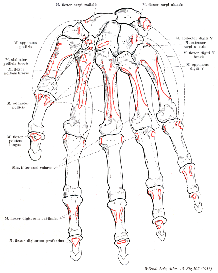→(掌側骨間筋は、それぞれ中手骨から起こり、対応する指の指背腱膜に付く。筋は第2、第3および第5指が中指に向かって内転できるように配列さえている。中指は掌側骨間筋を欠く。第1掌側骨間筋はしたがって第2中手骨の尺側に位置し、第2と第3掌側骨間筋は第4と第5中手骨の橈側から起こる。母指の“掌側骨間筋”は母指内転筋に取り込まれている。)