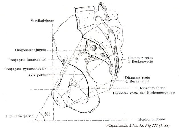 →(骨盤下口にあって、尾骨尖と恥骨結合下縁との距離で、9.5~10cm。この結合線はたいていは尾骨の屈曲性によって変化しうるから、骨盤峡部における正中結合線が縦経として大切な役割を演ずることになる。)