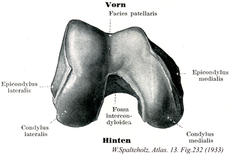 →(内側顆と外側顆の下面を被う関節面の前端は互いにつながって膝蓋面をつくる。膝蓋面は中央に縦溝のあるややくぼんだ面で、膝蓋骨の後面に対向する。)