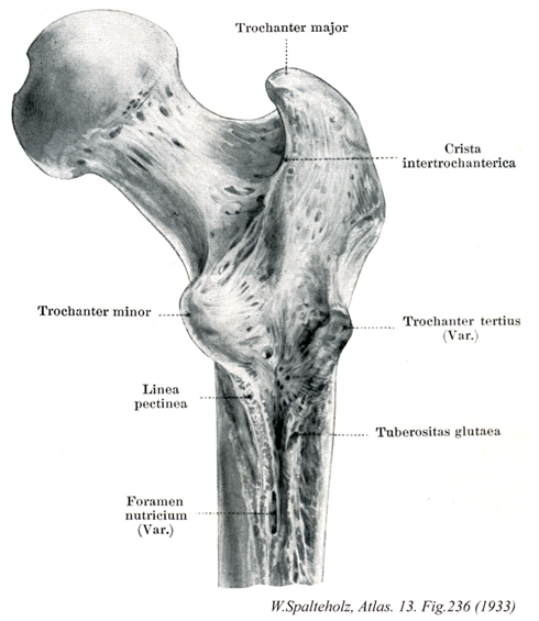 →(大腿骨頚の上外側には大転子(中臀筋、小臀筋、梨状筋がつく)が突出している。転子とはハンドルのことで、その力学的な効用は、たとえば大転子につく中臀筋が大腿骨を外転させている。)