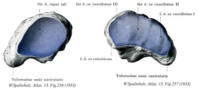 →(足の舟状骨は中心足根骨に属し、足根の内側で距骨と楔状骨の間にある。前後に扁平な骨で、背側で凸面、足底側で凹面となっている。前面に3個の凸面の関節面があり、それぞれ内側楔状骨・中間楔状骨・外側楔状骨と関節する。後方は距骨頭に対する関節窩をなす。内側面は粗面状で下方に突出し舟状骨粗面をなす。皮下で触知できる。外側面で立方骨関節することも多い。底側面で舟状骨粗面に近い部に後脛骨筋腱の深層のものが通る浅い斜めの溝がある。ラテン語のNavisの縮小形Navicula(小舟)に由来する。)