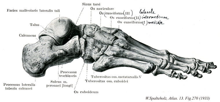 →(舟状骨と第三中足骨の間に位置する。その楔形の底面は上方を向く。外側楔状骨の外側面は立方骨の内側面に接する。)