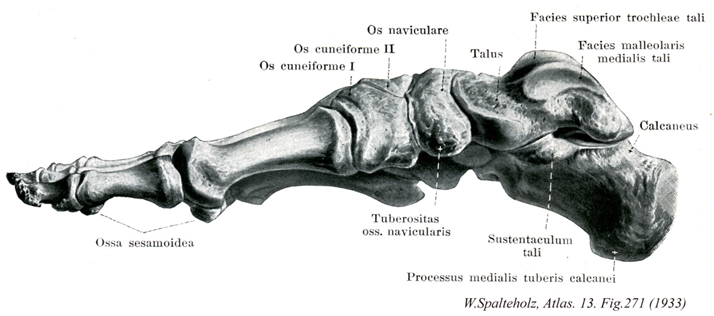 →(足の舟状骨の内側部は舟状骨粗面として内方に向かって突隆し、体表から離れる。下面で舟状骨粗面に近く、後脛骨筋の深在の腱を容れる浅い溝が斜めに走る。舟状骨粗面に下方に着く後脛骨筋の一部の腱のなかに種子骨、外頚骨を含むことがある。)