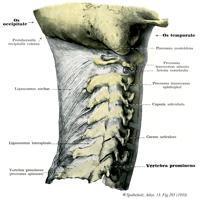 - 295_05【Ligamentum nuchae; Nuchal ligament; Nuchal septum項靱帯;項中隔 Ligamentum nuchae; Septum nuchae; Septum medianum nuchae】 Sagittally widened continuation of the supraspinous ligament that extends from C7 to the external occipital protuberance. In humans it has little elasticity.