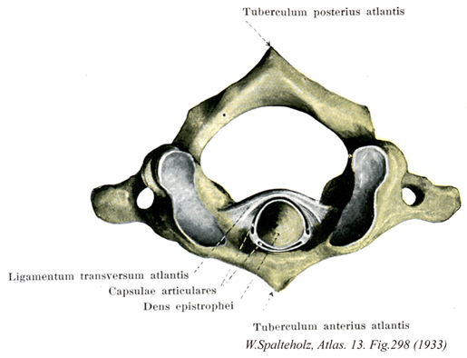 - 298_01【Transverse ligament of atlas環椎横靱帯 Ligamentum transversum atlantis】 Transverse band that extends from one side of the atlas to the other, passing behind the dens and holding it in position.