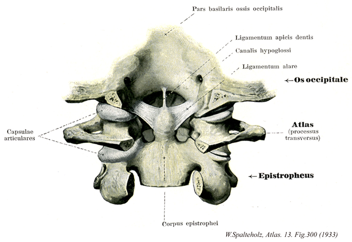 →(翼状靱帯は歯突起の上部の側面から起こる強い、厚い帯状の靱帯で、上外方に向かって後頭顆の内面に着く。頭関節における頭の過度の回旋を制限する。頭の回旋は頭を前屈した状態ではその範囲が狭く、後屈した状態では広い。これは前屈のみによっても翼状靱帯が緊張することがその理由の一つであると考えられている。)