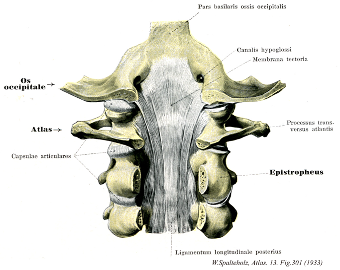 →(蓋膜は後縦靱帯の上部がつくる幅広い膜で、環椎十字靱帯を後から被い、大後頭孔前縁を越えて斜台に至り、後縦靱帯を後方から被う脳硬膜と共に骨に着く。Fickなど記述では、蓋膜は後縦靱帯上部の特に深層を指し、その線維は表層の後縦靱帯に比較して短く、下端は第2~3頚椎体に終わるとしている。蓋膜とは硬膜上腔の蓋をする膜という意味である。Tectoriaはtectum(蓋、屋根)の形容詞。)